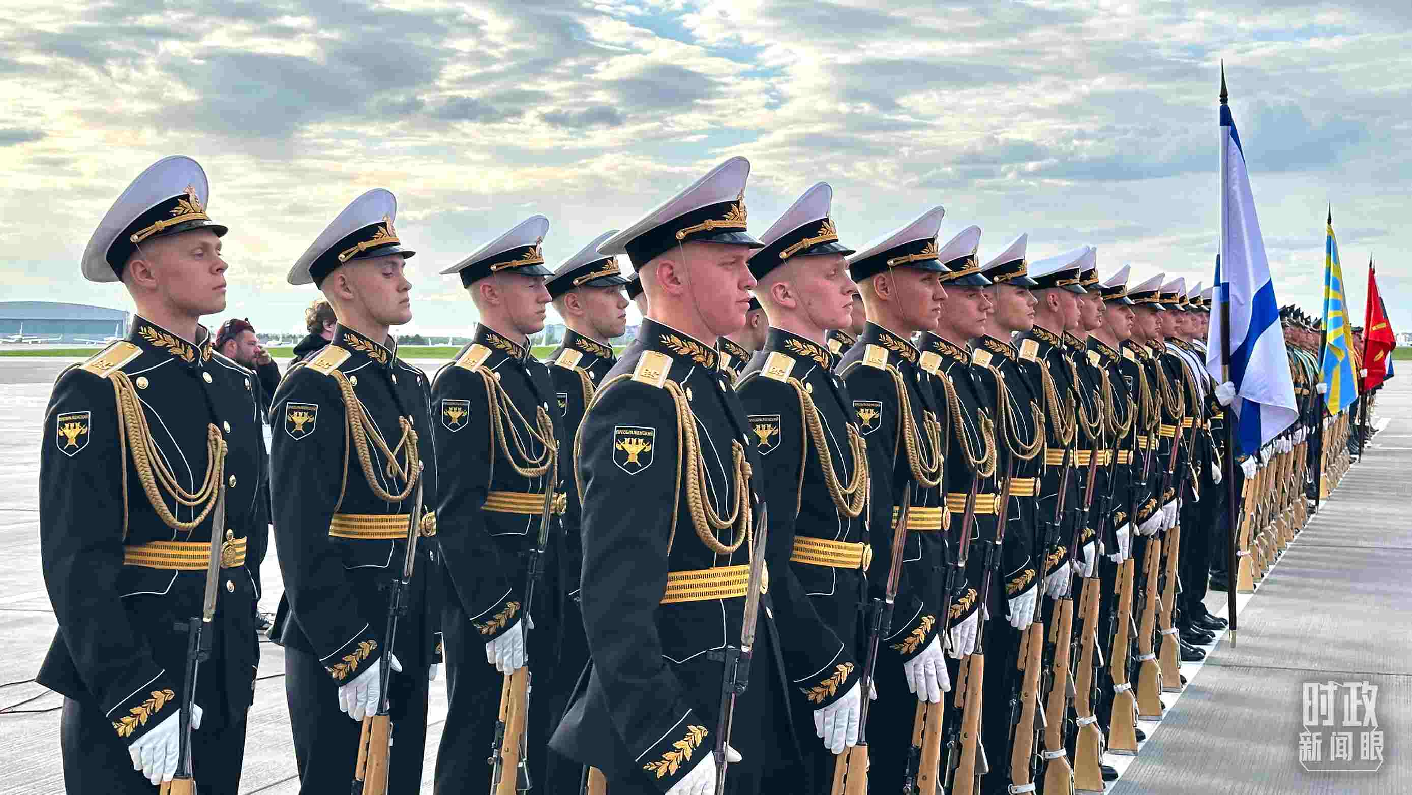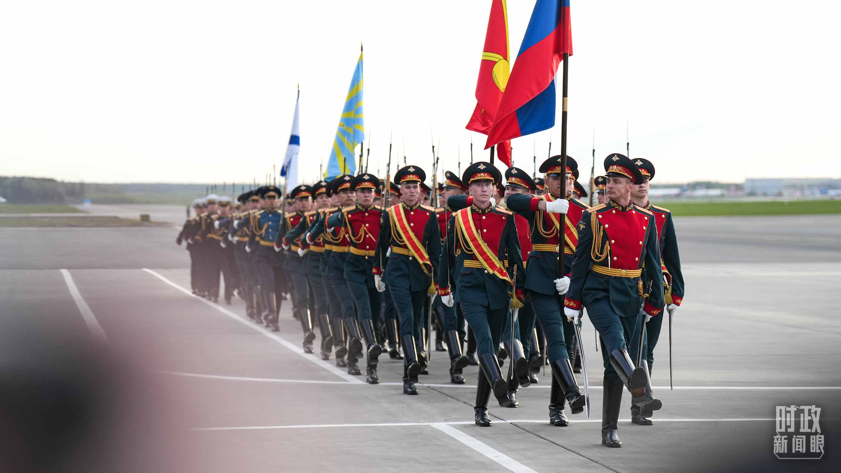 俄方在機(jī)場舉行隆重迎接儀式。軍樂團(tuán)奏中俄兩國國歌。習(xí)主席檢閱儀仗隊并觀看分列式。