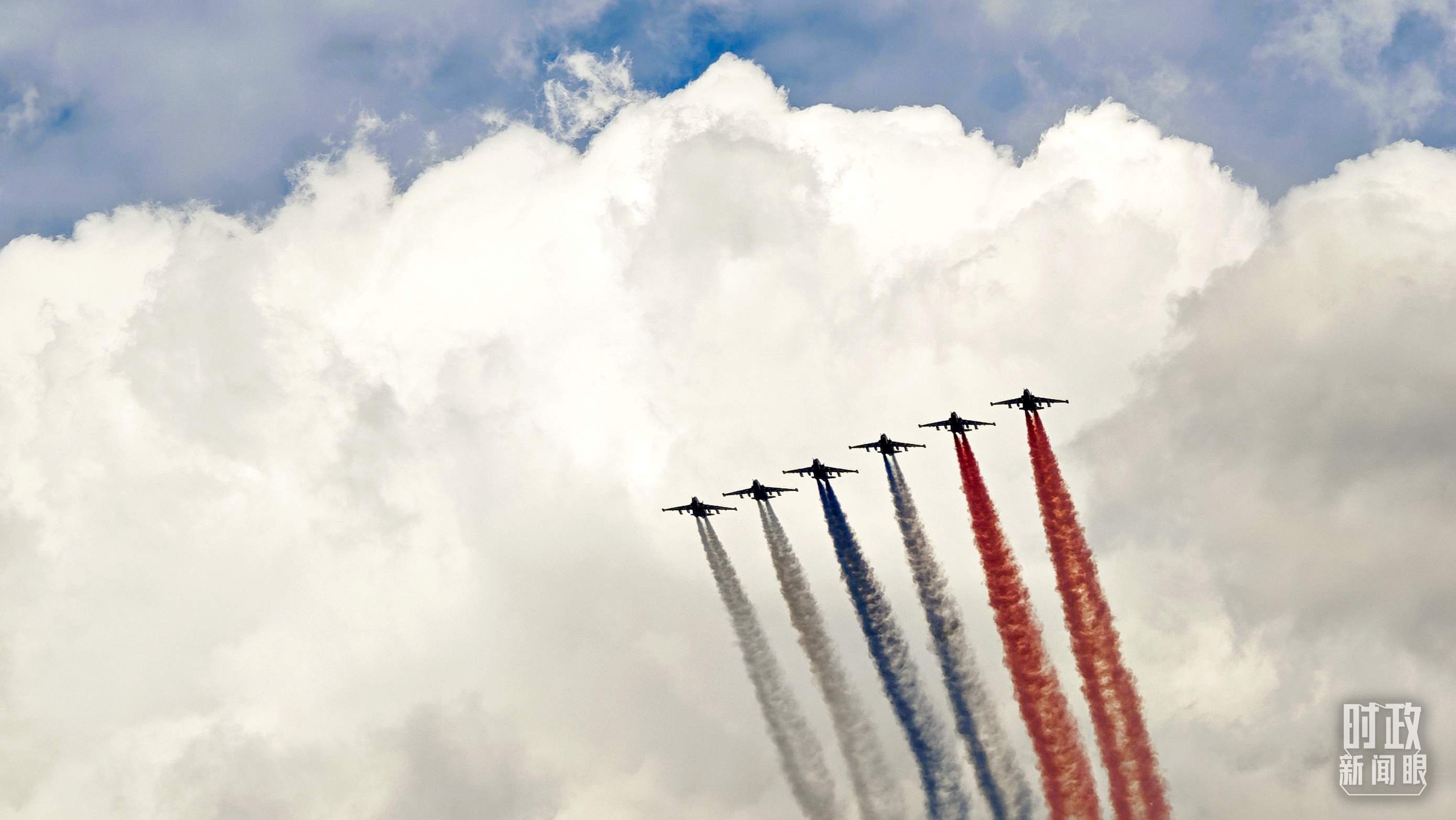 △5月7日,參加紀(jì)念蘇聯(lián)偉大衛(wèi)國戰(zhàn)爭勝利80周年慶典彩排的空中飛行梯隊飛越紅場。(總臺央視記者王哈男拍攝)
