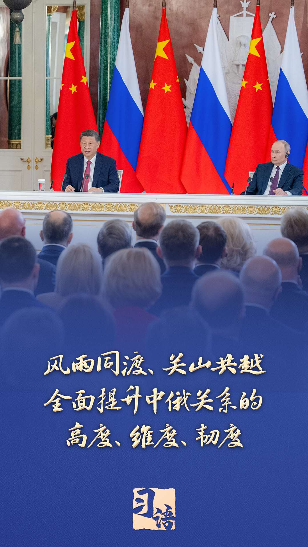 “面對(duì)變亂交織的國際形勢,中俄兩國要堅(jiān)定秉持永久睦鄰友好、全面戰(zhàn)略協(xié)作、互利合作共贏精神,風(fēng)雨同渡、關(guān)山共越,全面提升中俄關(guān)系的高度、維度、韌度,為世界和平和安全注入更多穩(wěn)定性,為全球發(fā)展繁榮提供更強(qiáng)推動(dòng)力?!碑?dāng)?shù)貢r(shí)間5月8日,習(xí)近平在同俄羅斯總統(tǒng)普京共同會(huì)見記者時(shí)指出。