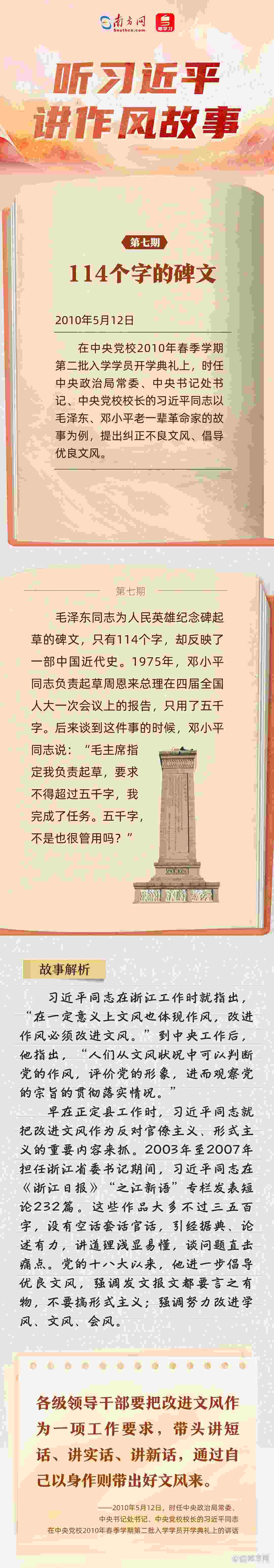 當前,全黨上下正在開展深入貫徹中央八項規(guī)定精神學習教育,縱深推進作風建設。關于作風建設,習近平總書記常用講故事的方式,傳達深意、感染他人,給人以思想啟迪。南方網、粵學習客戶端推出“聽習近平講作風故事”系列報道,與您一起感悟這些故事蘊含的深刻道理。 今天,推出《聽習近平講作風故事⑦丨114個字的碑文》,與您一起學習毛澤東、鄧小平老一輩革命家的文風。