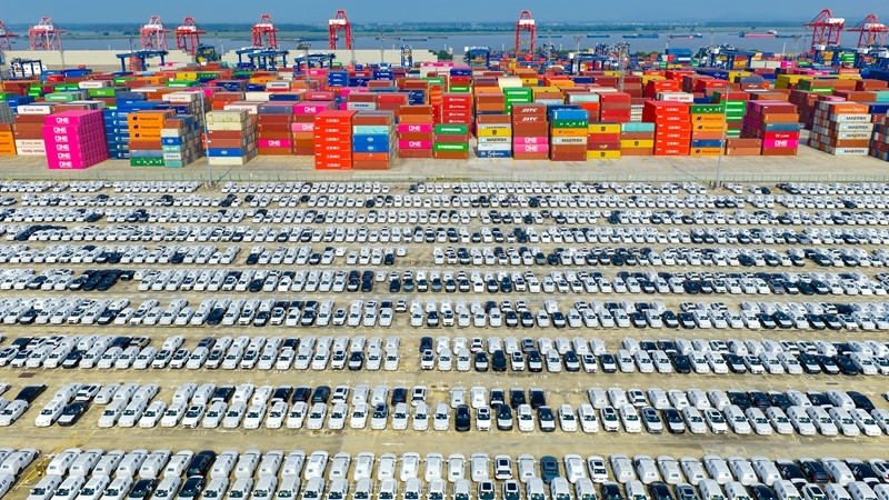 2025年10月4日在江蘇省港口集團(tuán)南京港龍?zhí)陡蹍^(qū)拍攝的準(zhǔn)備裝船出口的汽車(無人機(jī)照片)。新華社發(fā)(楊素平?攝)