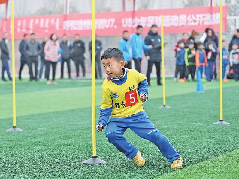 連續(xù)兩天的雨雪天氣沒有澆熄孩子們的熱情,球場上一群六七歲的小朋友努力奔跑著。日前,在呼和浩特市賽罕區(qū)全民健身中心、新城區(qū)成吉思汗街小學(xué)、玉泉區(qū)通順街小學(xué)、賽罕區(qū)騰飛路小學(xué)4個地點(diǎn)進(jìn)行了呼和浩特市2011—2012年齡段男子足球隊(duì)員的選拔。孩子們雖然動作稚嫩、但個個都表情認(rèn)真,全力以赴地進(jìn)行著測試。