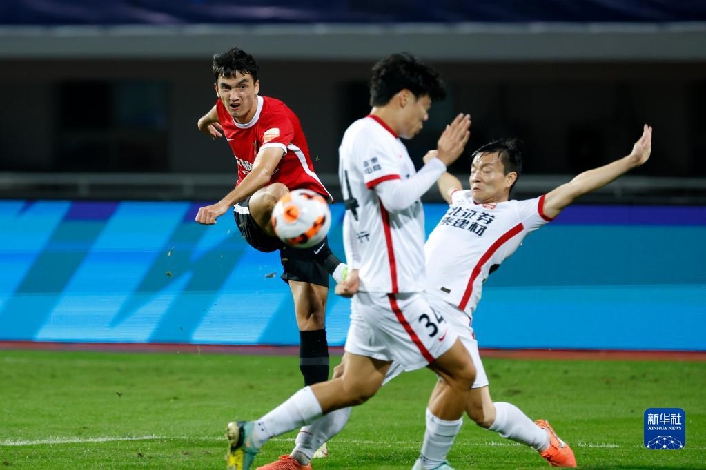 11月7日,成都蓉城隊球員木塔力甫·依明卡日(左)在比賽中射門。新華社記者 沈伯韓 攝