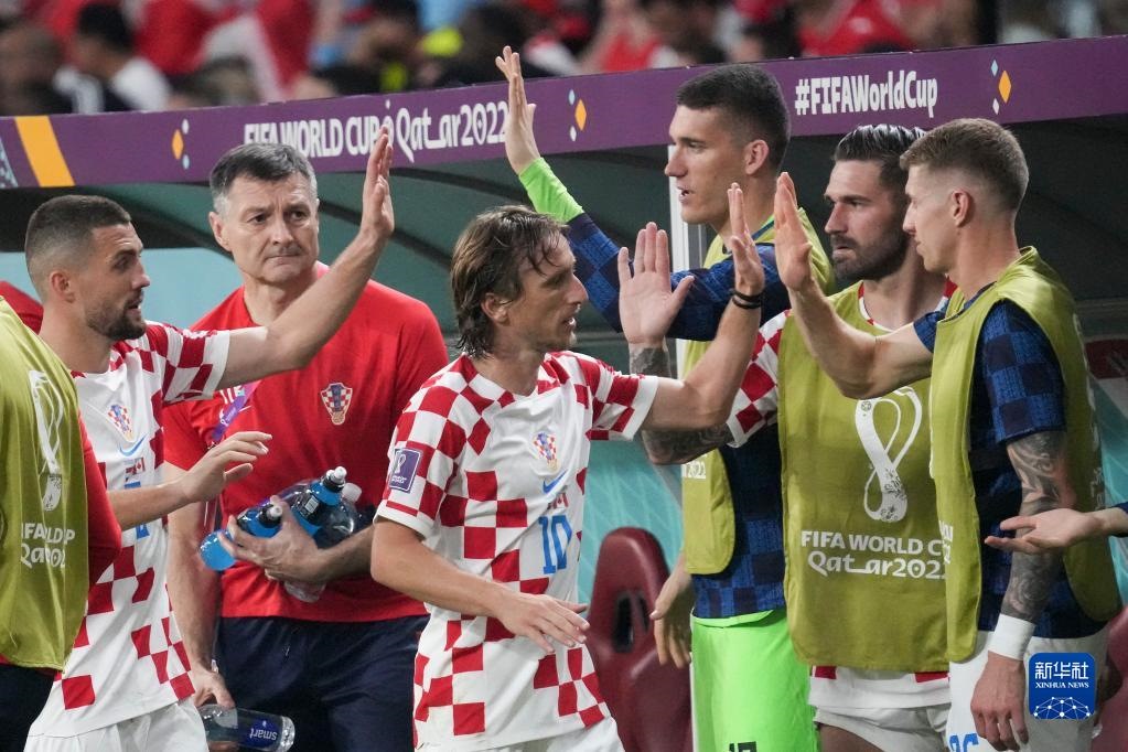 11月27日,克羅地亞隊(duì)球員莫德里奇(左三)在比賽中被替換下場后與隊(duì)友致意。