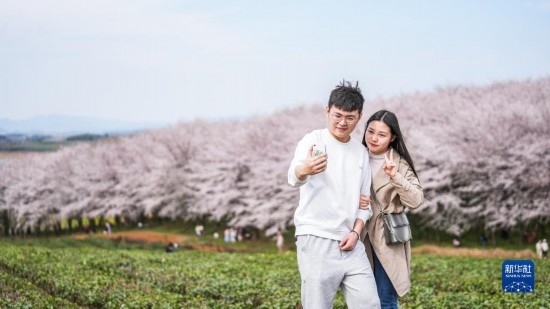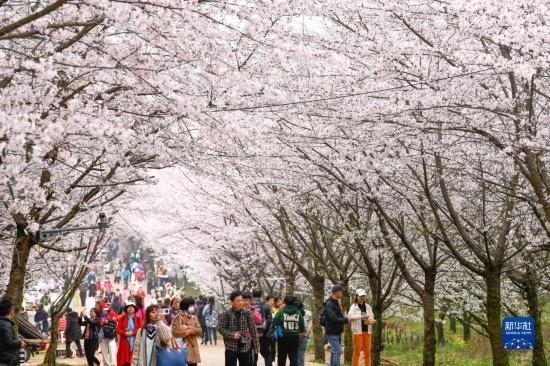 近日,貴州省貴安新區(qū)櫻花園內(nèi)的2.4萬畝櫻花競相綻放,如雪似霞,吸引游客前來賞花觀光。