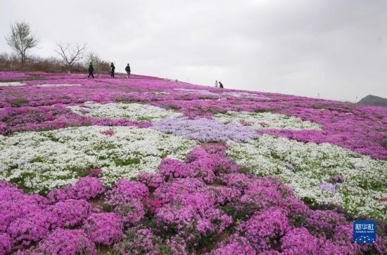4月6日,游客在遷西縣大黑汀水庫東岸的芝櫻花海觀光。