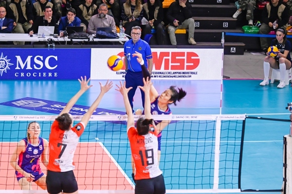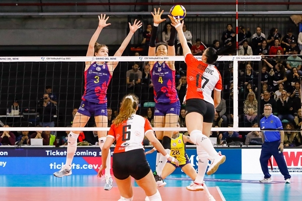 朱婷(4號)與貝麗恩攔網(wǎng)。圖片來源:歐聯(lián)杯官網(wǎng)