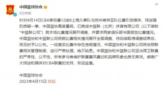 CBA聯(lián)賽官方微博15日凌晨發(fā)布消息表示:針對(duì)4月14日2022-2023賽季CBA聯(lián)賽季后賽12進(jìn)8、上海久事隊(duì)與蘇州肯帝亞隊(duì)比賽引發(fā)媒體、球迷強(qiáng)烈質(zhì)疑一事,中籃聯(lián)(北京)體育有限公司(以下簡(jiǎn)稱“中籃聯(lián)公司”)高度重視,已就本場(chǎng)比賽情況展開調(diào)查,中國(guó)籃協(xié)也在第一時(shí)間責(zé)成中籃聯(lián)公司查明情況。中籃聯(lián)公司待后續(xù)取得調(diào)查結(jié)果后,將及時(shí)予以發(fā)布。