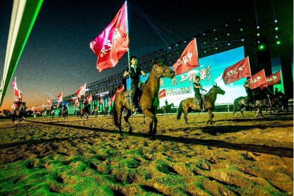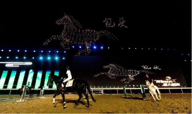 開(kāi)幕式文體表演由《馬術(shù)方陣一馬當(dāng)先》、歌伴舞《我的城我的馬》、《名馬展示策馬揚(yáng)鞭》、《單馬技巧雙翼神馬》、《馬障礙秀躍馬揚(yáng)鞭》、《馬術(shù)秀人馬合一》、歌伴舞《騎跡包頭》、《無(wú)人機(jī)秀馬上精彩》八塊內(nèi)容組成。當(dāng)晚的賽汗塔拉馬術(shù)賽場(chǎng)流光溢彩、氣氛熱烈,場(chǎng)內(nèi)座無(wú)虛席、歡聲雷動(dòng)。20時(shí)30分許,主騎手手持國(guó)旗,副騎手手持馬城旗幟,運(yùn)動(dòng)員方陣、民族方陣、女騎方陣、馬主方陣入場(chǎng),騎手們精神飽滿、英姿颯爽,不時(shí)揮手致意,現(xiàn)場(chǎng)觀眾用熱烈的掌聲和歡呼聲,歡迎他們的到來(lái)。達(dá)茂旗9歲賽馬冠軍阿茹樂(lè)手持彩旗引出世界名馬亮相,40對(duì)人馬合一的“千古馬頌”表演震撼全場(chǎng),1000架無(wú)人機(jī)躍然天空,點(diǎn)亮“騎跡包頭 馬上精彩”的字樣……藍(lán)天、碧水、凈土的包頭在策馬奔騰的馬術(shù)競(jìng)技中拉開(kāi)了“中國(guó)馬城”的壯麗畫(huà)卷。