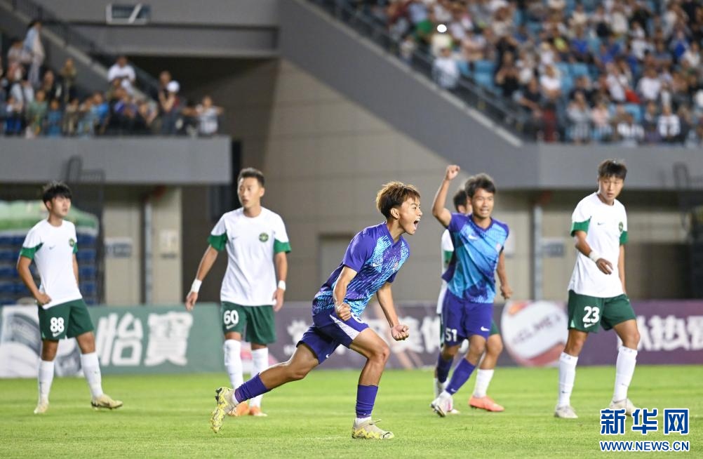 ??6月15日,浙江俱樂(lè)部U21隊(duì)球員王鈺棟(前)在比賽中慶祝進(jìn)球。