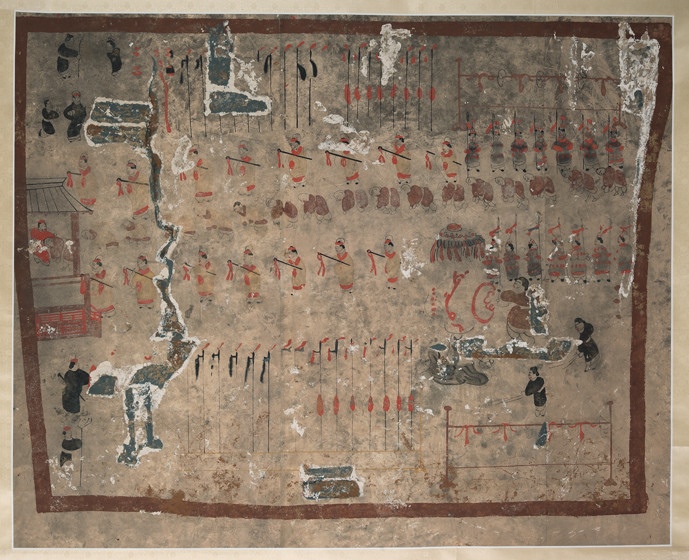再繞回前室中層,橫跨東北西3面墓壁即是《護烏桓校尉出行圖》。墓主人所乘軺車,駕3匹黑馬,榜題“使持節(jié)護烏桓校尉”等字,主車前后有鼓車、斧車,層層環(huán)護眾多武官、兵丁,隨從有“別駕從事”“功曹從事”“校尉行部”等下屬官職,連車列騎,旗旌飄揚,場面極為壯觀。中室東壁下半部描繪的是《寧城圖》與《護烏桓校尉幕府圖》。《寧城圖》畫有城垣、城門、衙署等內(nèi)容,其中寧城南門外武士持戟列隊、身著胡服的少數(shù)民族人物徐徐入內(nèi)的場景最為突出。占據(jù)主畫面的是《護烏桓校尉幕府圖》,由于任護烏桓校尉官職是墓主人一生中最值得炫耀的經(jīng)歷,所以,此圖描繪得最為詳細(xì)夸張,是整個壁畫中的核心部分。整個幕府分為堂院、營舍和庖舍3個部分,堂屋為高大的廡殿式房屋,墓主人端坐堂上,堂下藝人在表演樂舞雜耍,少數(shù)民族人物伏拜覲見,周圍環(huán)立官吏武士,場面喧囂隆重。營舍位于幕府后院,是幕府中管理軍務(wù)的機構(gòu)所在,庖舍位于幕府的西南角,掌管幕府廚飲之事。