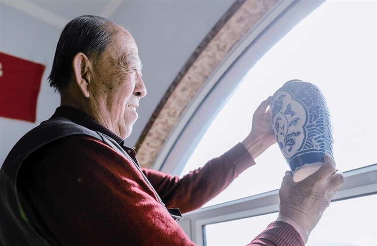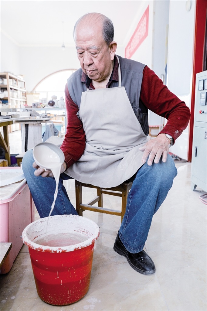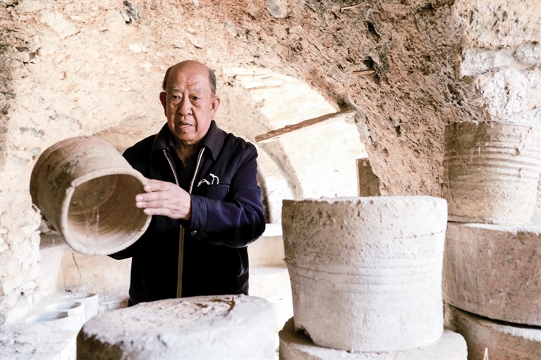 隨后,他走進“饅頭窯”旁邊的一口窯洞,這是當時張家的一間手工作坊,揉泥、拉坯、上釉等一系列制作陶瓷的工序都是在這里完成?!拔揖统錾谶@個村子,已經是張家瓷藝的第九代傳人了。作為中國磁州窯譜系,清水河黑礬溝瓷藝生產歷史至少已有800年?!标P于這項非遺的歷史故事,張選老人向記者娓娓道來:大約400年前,他們張家走西口從山西來到清水河謀生,當時清水河黑礬溝有一家姓杜的人家做陶瓷營生,張家的先人在杜家打工,大概這樣打工做了三輩人吧,杜家忽然不做了,搬離了黑礬溝,他們張家便把杜家的產業(yè)買了下來繼續(xù)做。“那個時候黑礬溝生產的瓷器都與人們生活息息相關,比如腌菜缸、水甕、碗盤等,一個家庭手工作坊一天能生產500個碗呢,生意很好,人們靠做這個營生也過上了不錯的生活?!睆堖x回憶著清水河瓷藝鼎盛時期的場景。上個世紀70年代,由于交通、技術等原因,黑礬溝燃燒了幾百年的窯火熄滅,傳統(tǒng)“饅頭窯”被正式廢棄,轉移到窯溝鄉(xiāng)后手工作坊變成了機械化生產,這也讓清水河的陶瓷名聲大噪。當時,在窯溝鄉(xiāng)一帶,從事陶瓷生產的有近萬人,陶瓷業(yè)成為清水河支柱產業(yè)。