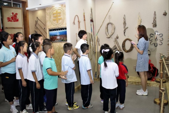 這里的一件件農具、生活用品等都是祖輩們生產生活的必需品,就是這些簡陋粗糙的物件,浸透了他們的斑斑汗跡和聰明智慧。在館外主要展示了大型農耕工具、生活日常用品等,并在農具認知課程過程中,教孩子們了解怎樣使用石磨、風車、釘耙、犁、簸箕、扁擔等農具。