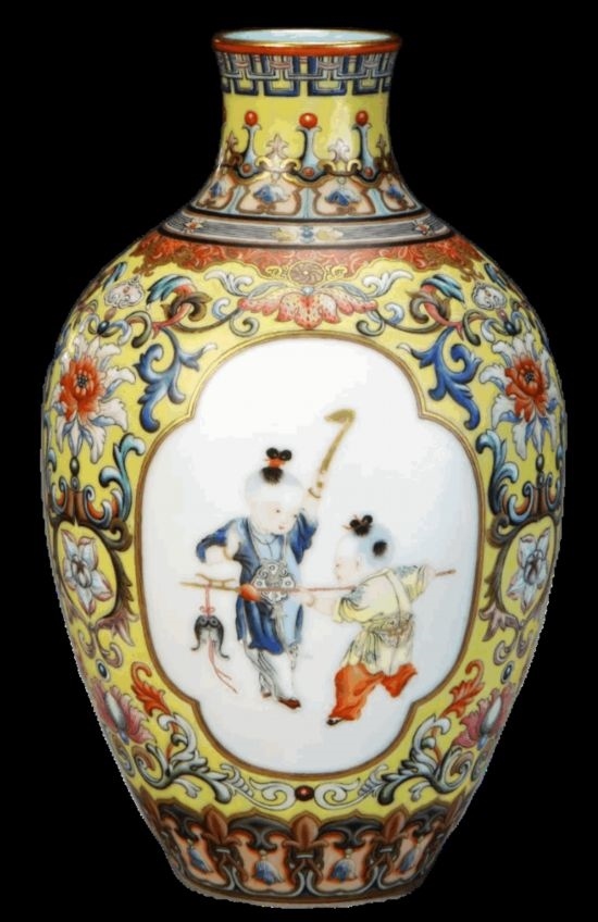 清乾隆·黃地琺瑯彩開(kāi)光嬰戲紋瓶。開(kāi)光是指在器物的顯著部位以線條勾勒出圓形、方形、菱形、扇面形、云頭形或花形等多種式樣的欄框,框內(nèi)繪各種圖案,起到突出主題紋飾的作用。此法猶如古建筑上開(kāi)窗見(jiàn)光,故名開(kāi)光。(圖片來(lái)源:故宮博物院)