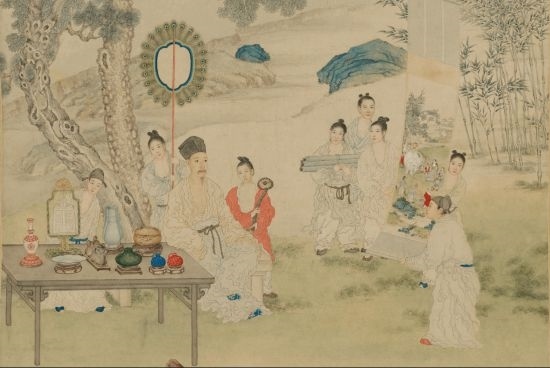 清·郎世寧《弘歷觀畫圖》軸(局部),展現(xiàn)出乾隆對(duì)古玩字畫的熱愛(ài)。(圖片來(lái)源:故宮博物院)