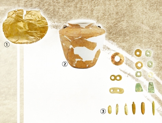 圖①:鄭州商都書(shū)院街墓地出土的金覆面。