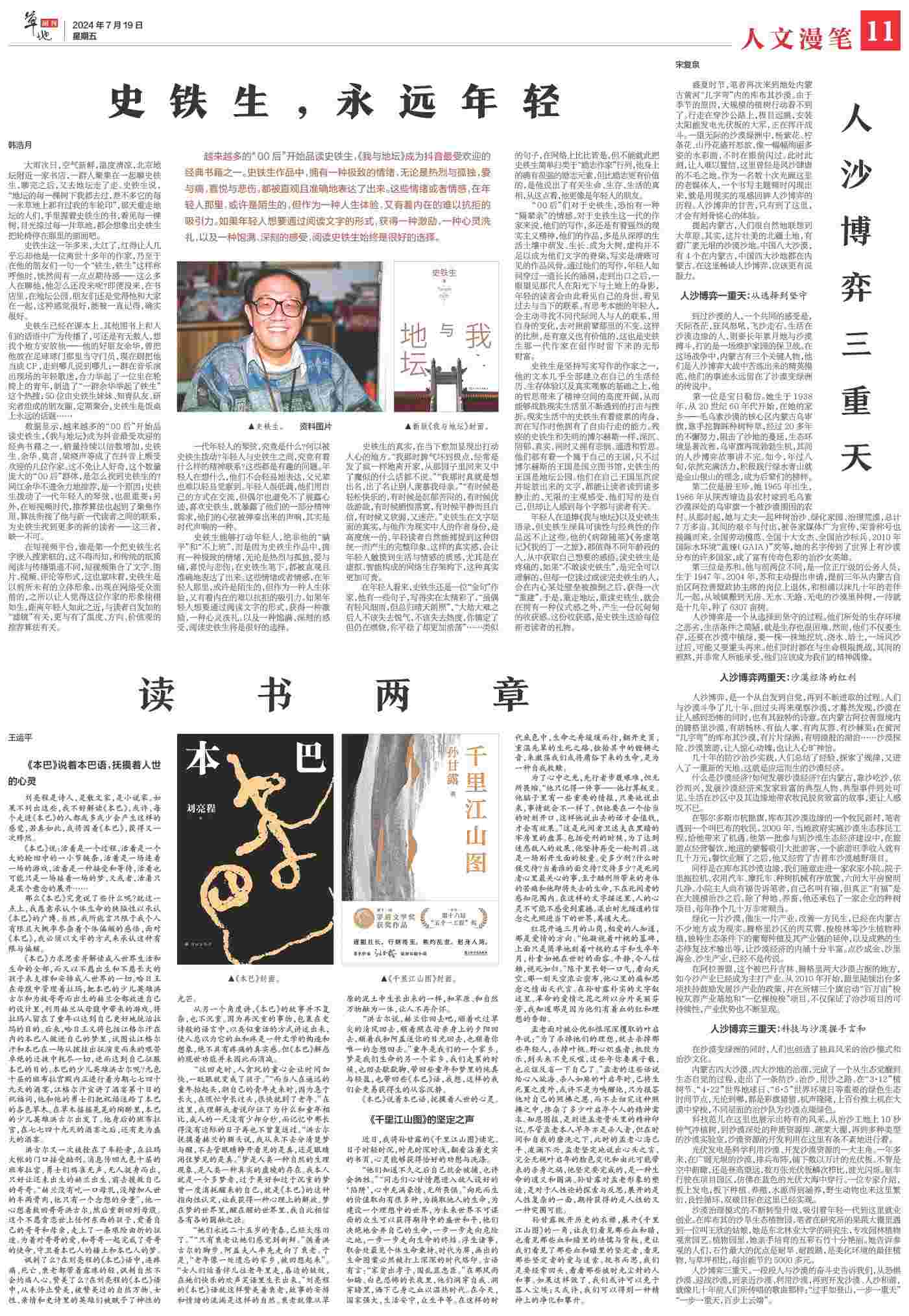 到過沙漠的人,一個(gè)共同的感受是,天際蒼茫,狂風(fēng)怒吼,飛沙走石。生活在沙漠邊緣的人,則要長年累月地與沙漠搏斗,打的是一場維護(hù)家園的保衛(wèi)戰(zhàn)。在這場戰(zhàn)爭中,內(nèi)蒙古有三個(gè)關(guān)鍵人物,他們是人沙博弈大戰(zhàn)中苦練出來的精英模范,他們的事跡永遠(yuǎn)留在了沙漠變綠洲的傳說中。