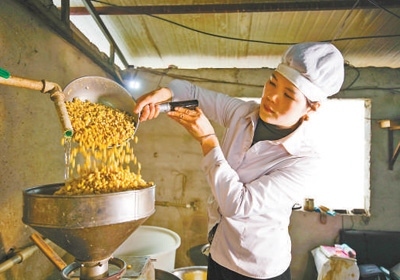 貴州省貴陽市修文縣久長鎮(zhèn)孟沖村一家豆腐加工作坊,工作人員將大豆舀入打漿機加工。周訓超攝(人民視覺)