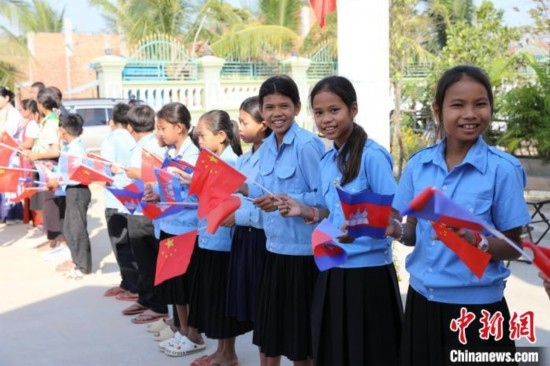 1月19日,“絲路心相通”春節(jié)文化交流活動(dòng)在茶膠省中柬友好扶貧示范村達(dá)弄村活動(dòng)中心舉辦,學(xué)生們?cè)诘缆放耘e旗歡迎。項(xiàng)薪宇 攝