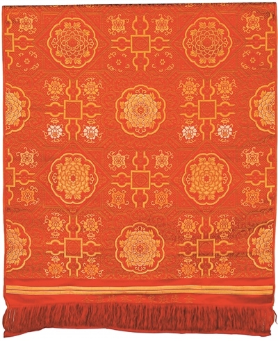 宋錦主產(chǎn)地為蘇州,與云錦、蜀錦并稱為中國古代三大名錦。宋錦采用經(jīng)線緯線聯(lián)合顯花的組織結(jié)構(gòu)和彩拋換色工藝,風(fēng)格古樸典雅,在古代多用于書畫裝裱,有著獨(dú)特的藝術(shù)魅力。清代紅地如意牡丹紋天華錦為宮廷用宋式錦,紅緞地上以彩色絲線和金線作緯顯花,圖案基本骨架為典型的宋錦紋樣——“米”字狀八達(dá)暈式樣,飾有牡丹、蓮花、如意紋等,寓意富貴安康、吉祥如意。