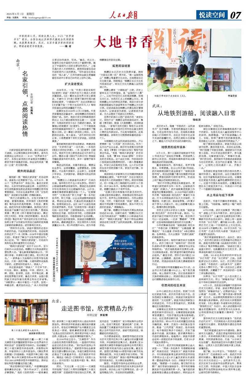 書香潤(rùn)澤心靈,閱讀點(diǎn)亮人生。4·23“世界讀書日”前后,全國(guó)各地以多種形式掀起全民閱讀熱潮。本版聚焦南京、武漢、北京豐富多彩的閱讀活動(dòng),帶讀者感受書香氛圍。