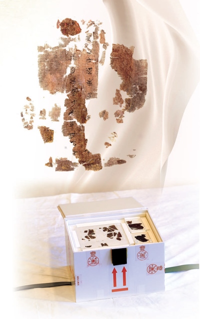 工作人員小心翼翼地打開(kāi)文物包裝箱,《五行令》《攻守占》露出真容,深褐色的殘片被保存在有機(jī)玻璃里。盡管歷經(jīng)2000余年,但帛書(shū)上的殘留文字依稀可辨。