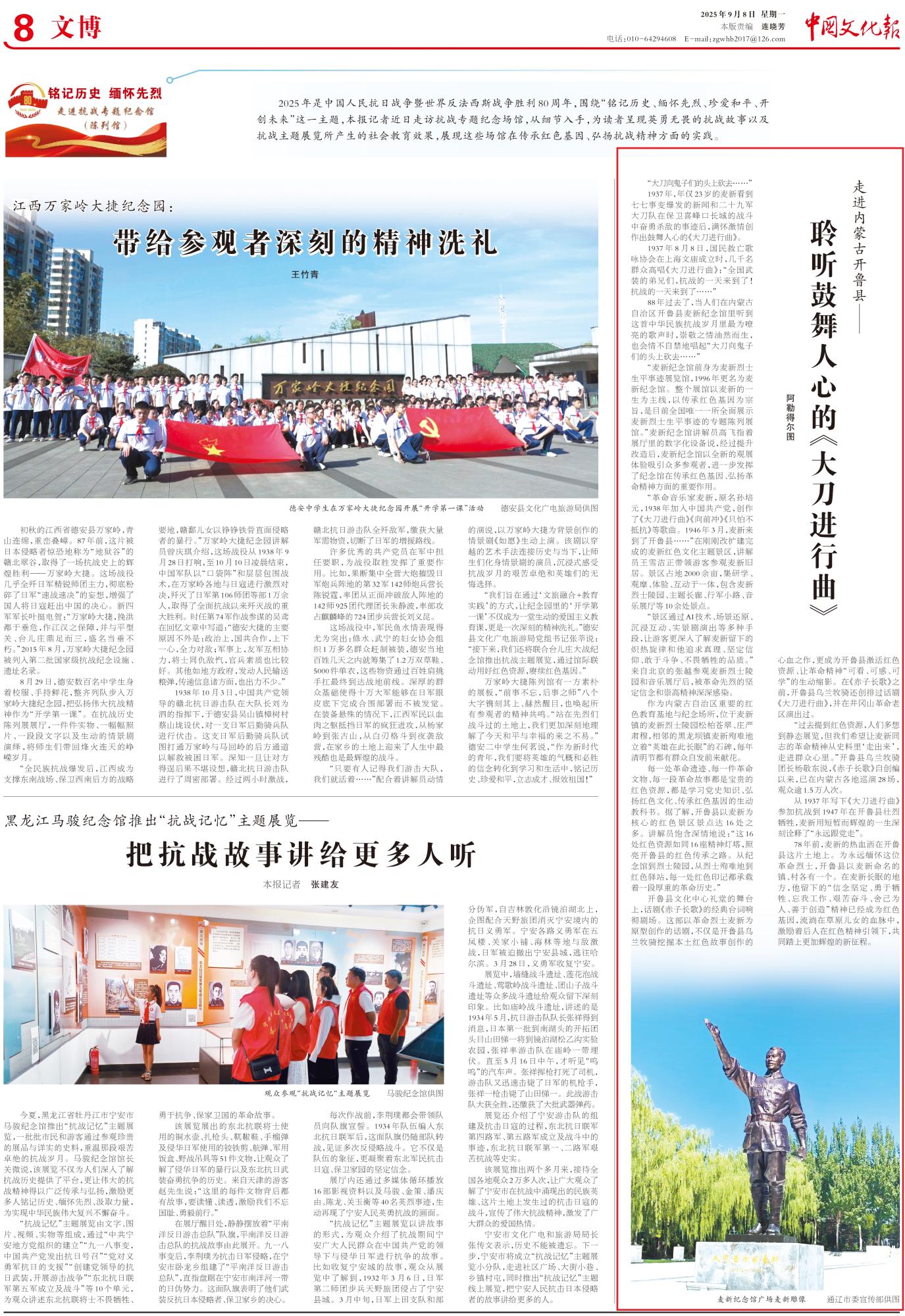 2025年9月8日,《中國文化報》第8版整版刊發(fā)題為《走進內(nèi)蒙古開魯縣——聆聽鼓舞人心的《大刀進行曲》》的文章,報道了內(nèi)蒙古開魯縣麥新紀念館以麥新的一生為主線,以傳承紅色基因為宗旨,是目前全國唯一一所全面展示麥新烈士生平事跡的專題陳列展館。經(jīng)過提升改造后,麥新紀念館以全新的觀展體驗吸引眾多參觀者,進一步發(fā)揮了紀念館在傳承紅色基因、弘揚革命精神方面的重要作用。