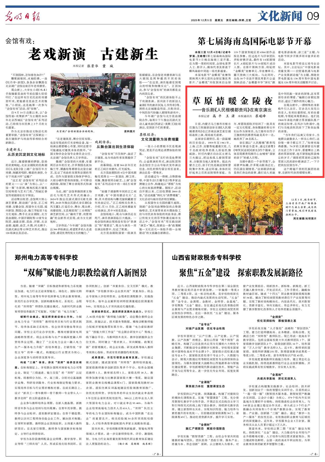 2025年12月5日《光明日報》第9版刊發(fā)了《原情暖金陵夜——音樂劇《人民楷模都貴瑪》在南京演出》的文章,報道了日前,內(nèi)蒙古烏蘭察布市察右后旗烏蘭牧騎原創(chuàng)音樂劇《人民楷模都貴瑪》在江蘇南京演藝星空劇場連續(xù)上演,現(xiàn)場座無虛席。這個跨越千里的民族團(tuán)結(jié)故事,在新時代依然熠熠生輝。