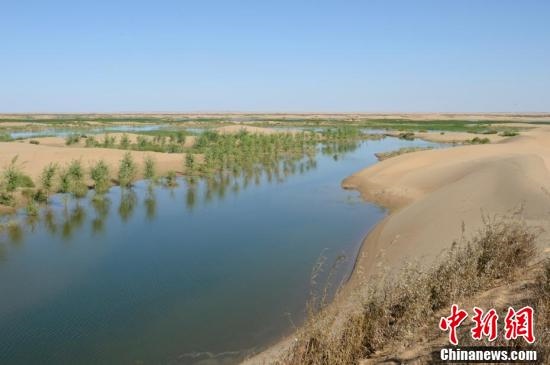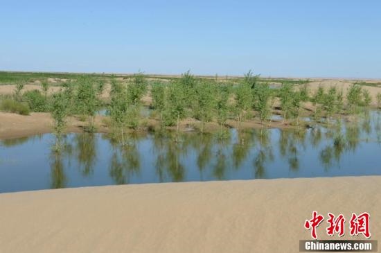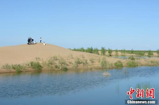 7月24日,引自黃河的凌水讓沙漠上充滿生機(jī)。據(jù)悉,中國(guó)第七大沙漠--庫(kù)布齊沙漠所處的杭錦旗境內(nèi),每年過(guò)境水量310億立方米,當(dāng)?shù)匾荒耆忠坏臅r(shí)間都是凌汛期。政府因地制宜,2016年投資建成分凌引水渠、生態(tài)圍堤等設(shè)施,自2016年至2018年黃河凌汛期以來(lái),累計(jì)分凌5千余萬(wàn)立方米,形成約36平方公里保護(hù)濕地的面積,原來(lái)為沙漠的地貌逐漸變成綠洲,農(nóng)牧民開始發(fā)展野牛養(yǎng)殖與農(nóng)家樂(lè)旅游業(yè)。中新社記者劉文華攝