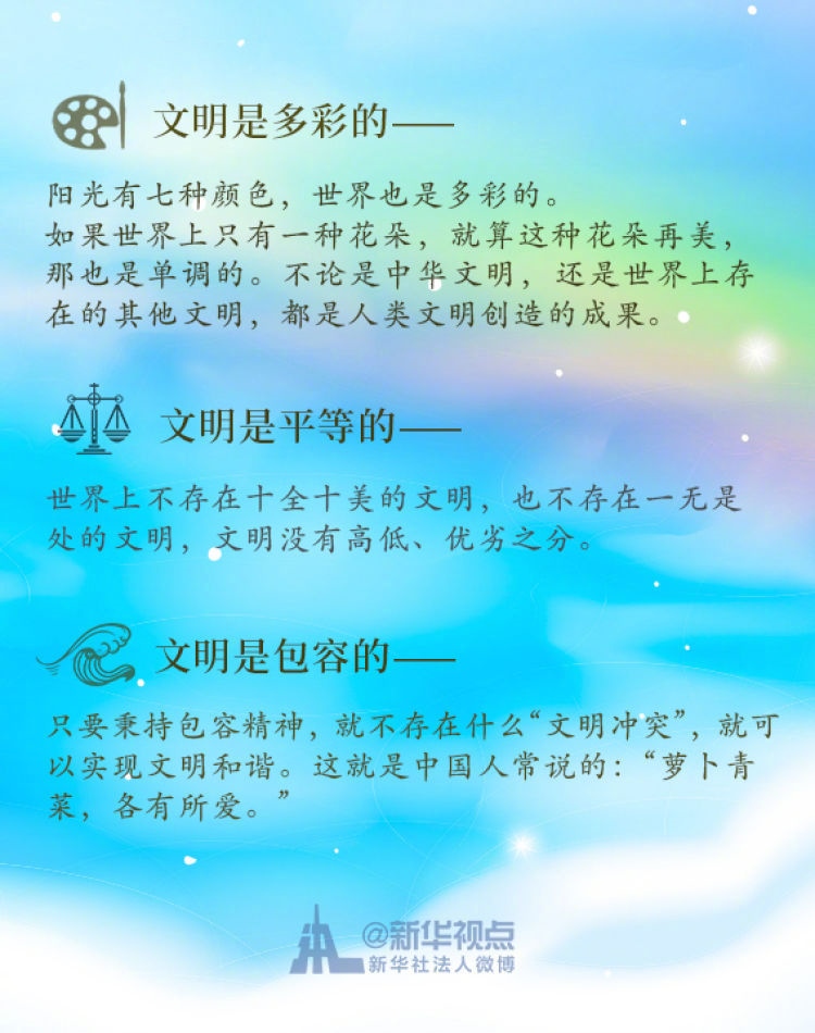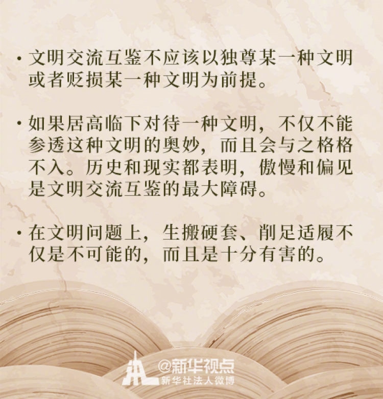 在這次演講中,習近平主席用生動的語言講明了對待不同文明應(yīng)有的態(tài)度和原則: