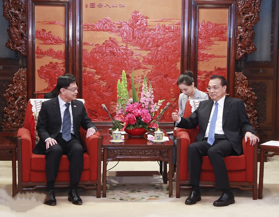 5月23日,國(guó)務(wù)院總理李克強(qiáng)在北京中南海紫光閣會(huì)見(jiàn)新加坡副總理兼財(cái)政部長(zhǎng)王瑞杰。新華社記者 龐興雷 攝