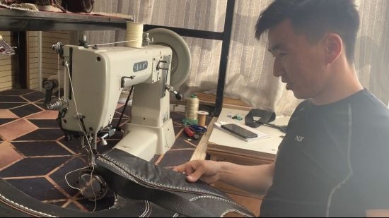 圖為阿巴嘎旗綜合實(shí)訓(xùn)基地內(nèi),一名小伙子正在制作搏克手的摔跤服。