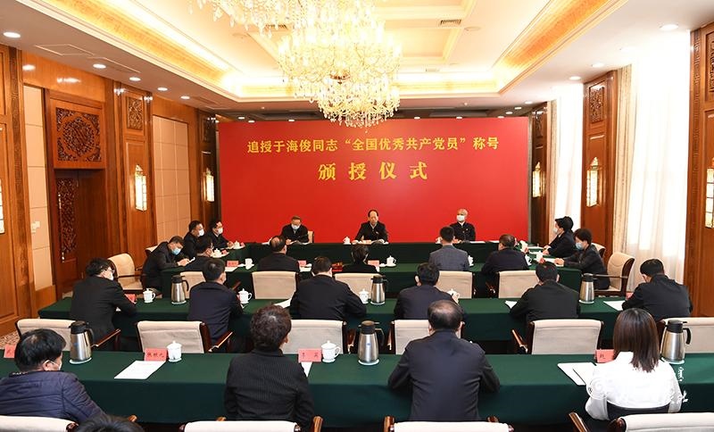 12月23日,受中央組織部委托,自治區(qū)黨委在呼和浩特舉行追授于海俊同志“全國優(yōu)秀共產黨員”稱號頒授儀式。自治區(qū)黨委書記、人大常委會主任石泰峰向于??⊥炯覍兕C授獎章證書并講話,號召全區(qū)廣大黨員干部深入學習于海俊同志先進事跡,以英雄為鏡、向模范對標,在本職崗位上展現(xiàn)共產黨人應有的責任擔當,為推動現(xiàn)代化內蒙古建設作出更大貢獻。自治區(qū)黨委常委、組織部部長楊偉東主持頒授儀式,并宣讀《中共中央關于授予周永開、張桂梅同志和追授于海俊、李夏、盧永根、張小娟、加思來提·麻合蘇提同志“全國優(yōu)秀共產黨員”稱號的決定》。自治區(qū)黨委常委、秘書長、自治區(qū)常務副主席張韶春出席。于??⊥炯覍賱⑽膽c,內蒙古森工集團黨委書記、董事長陳佰山,根河林業(yè)局防火管理處森防大隊副大隊長范紀東分別發(fā)言,他們以親身經歷和切身感受,滿懷深情地追述了于??⊥镜南冗M事跡和感人故事。