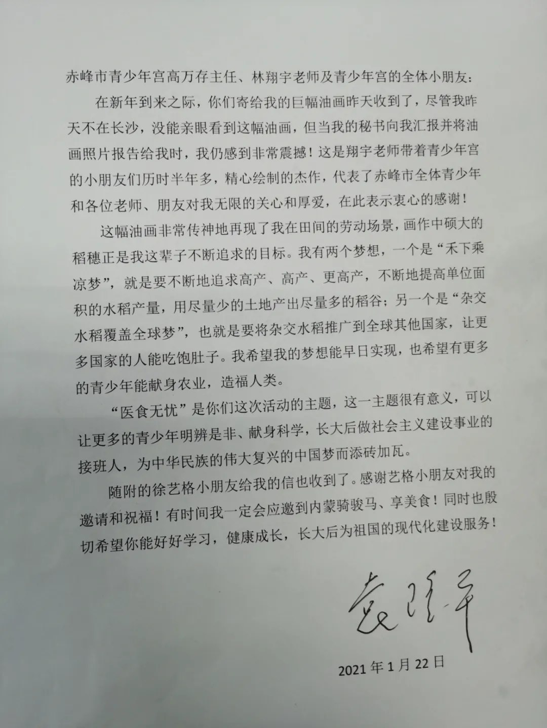 “袁隆平院士在百忙之中抽出寶貴時(shí)間給赤峰市青少年宮和孩子們回信,令我們始料未及,這封信我們反復(fù)讀了很多遍。深受感動(dòng)。”赤峰市青少年宮副主任高萬(wàn)存深有感觸的說(shuō),90歲高齡的袁隆平院士依然孜孜不倦的追求自己的兩個(gè)夢(mèng)想,并一直在為之不懈的奮斗,這種崇高的精神品質(zhì)值得當(dāng)代青年學(xué)習(xí)。袁隆平院士在信中對(duì)赤峰市青少年宮推出的“醫(yī)食無(wú)憂”的主題教育活動(dòng)給予了充分肯定,并寄語(yǔ)赤峰市青少年好好學(xué)習(xí),長(zhǎng)大后為祖國(guó)的現(xiàn)代化建設(shè)服務(wù),激勵(lì)著孩子們刻苦學(xué)習(xí),為夢(mèng)想努力拼搏,將來(lái)成為一名對(duì)社會(huì)有所貢獻(xiàn)的人。歡迎并期待袁隆平院士來(lái)內(nèi)蒙古品嘗美食,感受大草原的美麗風(fēng)光。