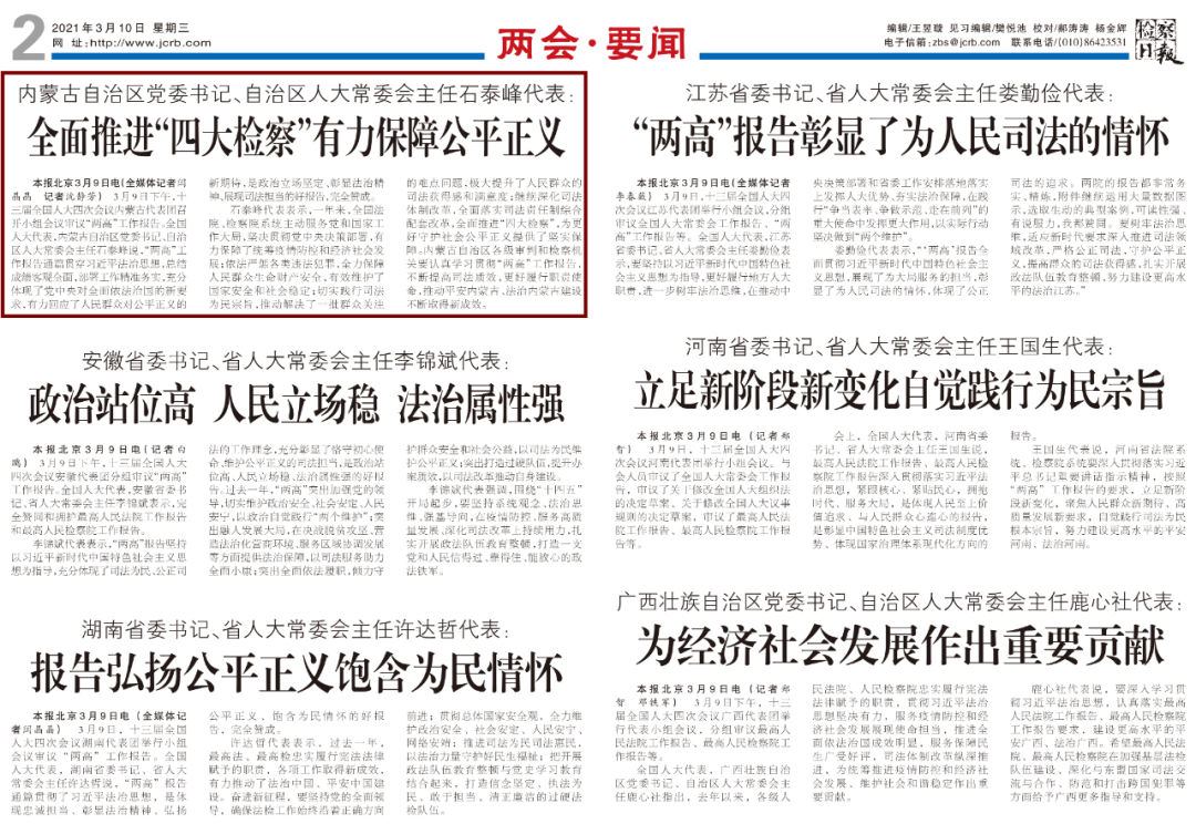 3月10日《檢察日報》第2版——內蒙古自治區(qū)黨委書記、自治區(qū)人大常委會主任石泰峰代表:全面推進“四大檢察”有力保障公平正義