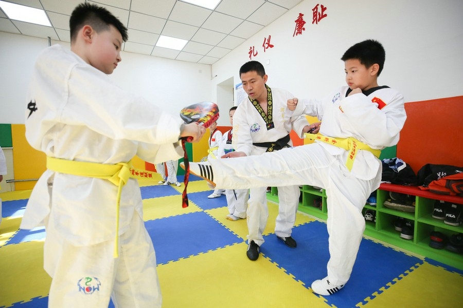 夏學(xué)偉老師正在教同學(xué)們練習(xí)跆拳道  彭瑞誠 攝影