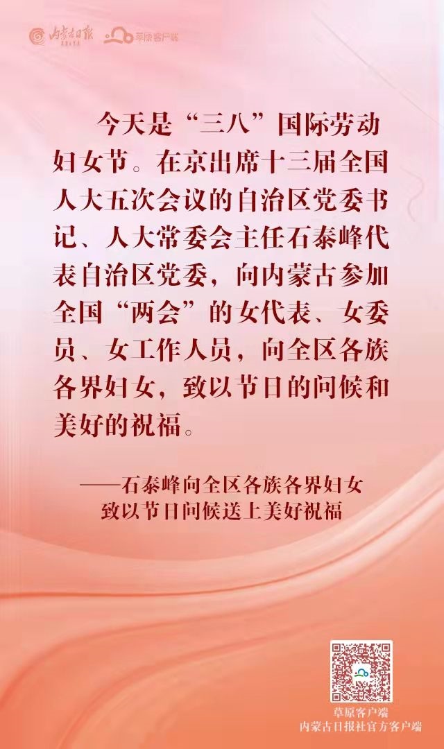 今天是“三八”國際勞動婦女節(jié)。在京出席十三屆全國人大五次會議的自治區(qū)黨委書記、人大常委會主任石泰峰代表自治區(qū)黨委,向內(nèi)蒙古參加全國“兩會”的女代表、女委員、女工作人員,向全區(qū)各族各界婦女,致以節(jié)日的問候和美好的祝福。(內(nèi)蒙古日報社融媒體記者 章奎)