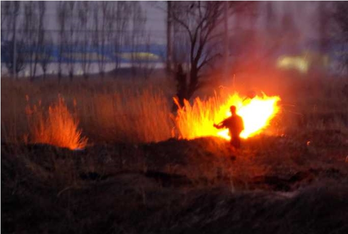 天剛剛黑下來(lái),一片農(nóng)田里冒起多個(gè)火點(diǎn)。幾分鐘后,火借風(fēng)勢(shì),迅速變成一條火線;繼而,田外大面積的野草被引燃,長(zhǎng)焦鏡頭里,火光中隱約晃動(dòng)著肩扛農(nóng)具的人影……