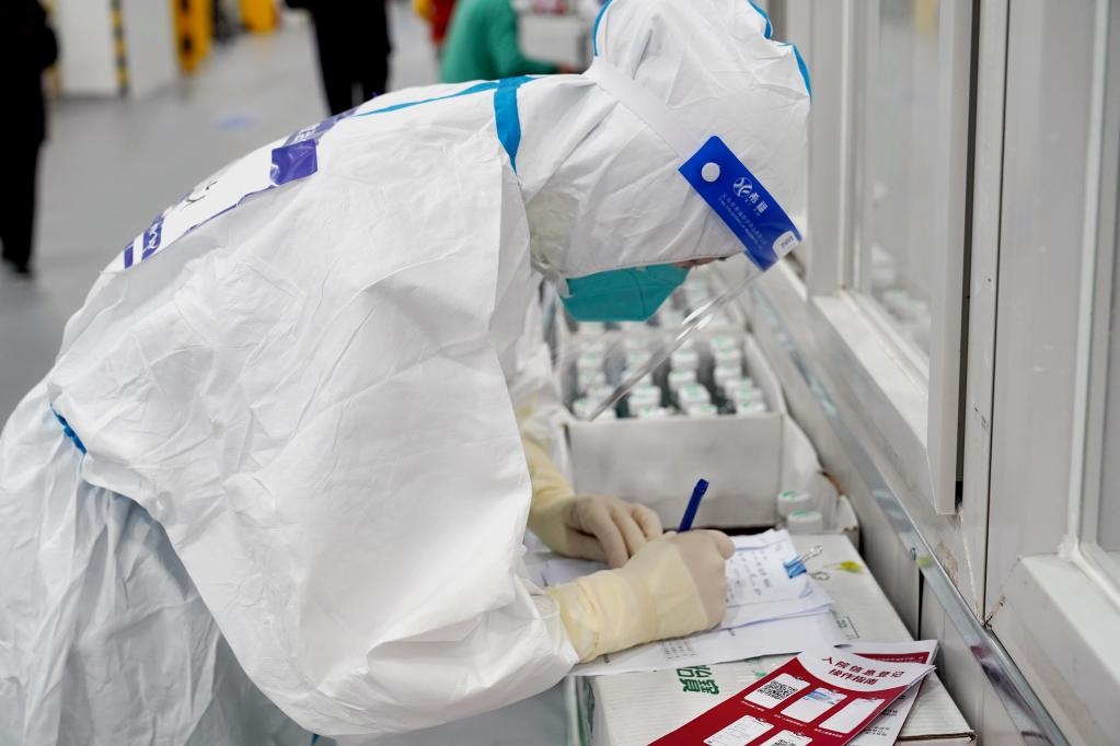 4月30日,上海臨港方艙醫(yī)院的醫(yī)護人員在整理感染者信息。新華社記者楊有宗 攝