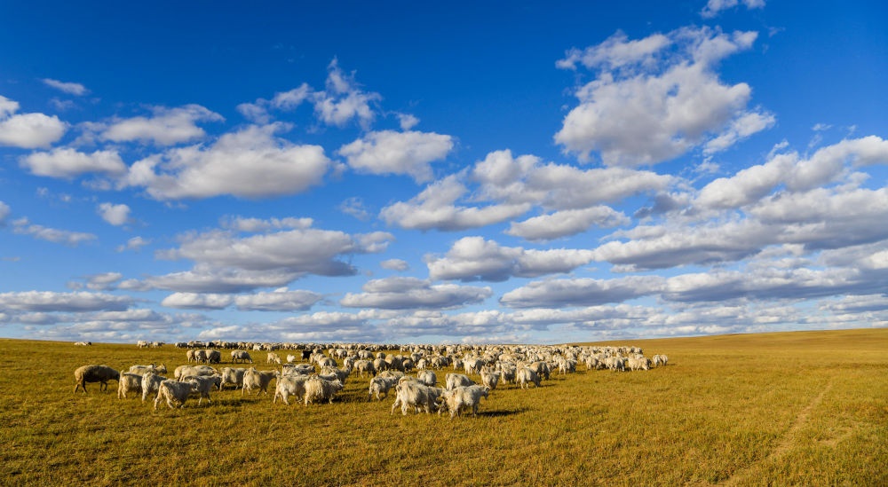 內(nèi)蒙古錫林浩特市寶力根蘇木上的羊群在覓食(2017年9月16日攝)。新華社記者連振攝
