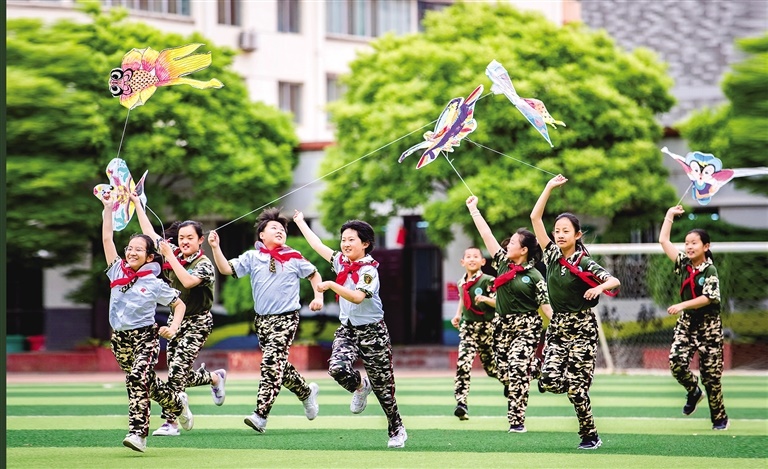 呼和浩特市玉泉區(qū)五塔寺東街小學(xué)學(xué)生放飛彩繪風(fēng)箏。內(nèi)蒙古日報社融媒體記者王磊攝