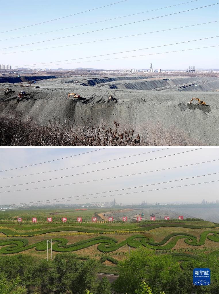 這是一張拼版照片:上圖為遼寧省撫順市西露天礦部分區(qū)域生態(tài)恢復前的場景(2019年3月6日攝,資料照片);下圖為2022年6月2日拍攝的遼寧省撫順市西露天礦部分區(qū)域生態(tài)恢復后的場景(新華社記者楊青攝,無人機照片)。新華社發(fā)