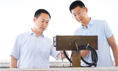 于志永(左)調(diào)研水質(zhì)提升改造項(xiàng)目,查看儀器運(yùn)行。 (圖片由海南區(qū)融媒體中心提供)
