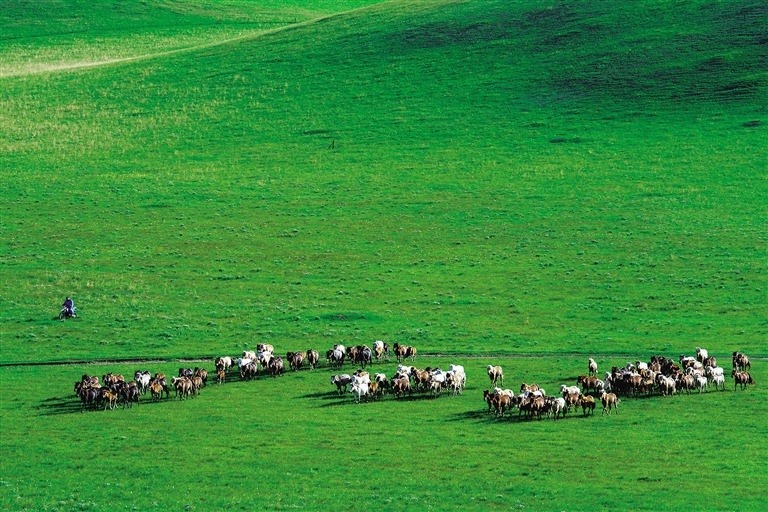 綠韻,疊翠流淌。保生態(tài)、治污染、促轉(zhuǎn)型,讓廣袤草原“帶薪休假”,在興安林?!皰旄d彙?,對(duì)重點(diǎn)沙漠“鎖邊治理”,累計(jì)營造林1.22億畝、種草2.86億畝,年均防沙治沙1200萬畝以上,各族兒女義不容辭扛起保護(hù)生態(tài)環(huán)境重大責(zé)任,厚植“北疆綠”、增色“中國藍(lán)”。