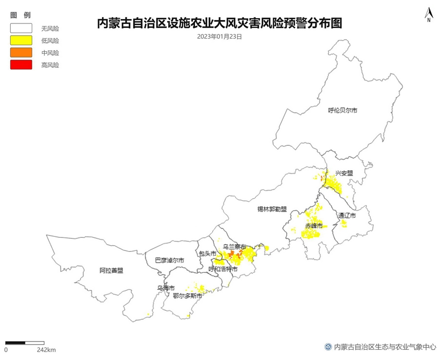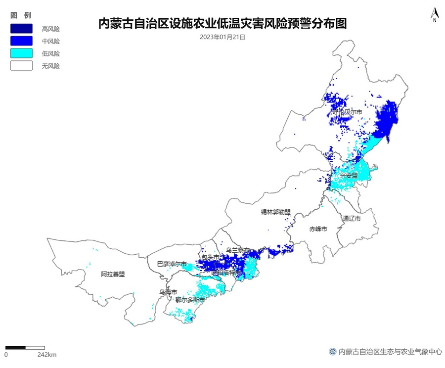 根據(jù)智能網(wǎng)格預(yù)報(bào)數(shù)據(jù),結(jié)合設(shè)施農(nóng)業(yè)低溫災(zāi)害和風(fēng)災(zāi)指標(biāo),1月21日至23日,呼倫貝爾市東南部、東南部偏西地區(qū)為設(shè)施農(nóng)業(yè)低溫災(zāi)害低風(fēng)險(xiǎn)地區(qū),東北部中部及東部、中部偏南大部、西部偏東部分地區(qū)為設(shè)施農(nóng)業(yè)低溫災(zāi)害中或高風(fēng)險(xiǎn)地區(qū),低溫災(zāi)害將導(dǎo)致作物生長(zhǎng)緩慢和受凍;21至23日,東南部部分地區(qū)、中部偏西南局部地區(qū)及鄂爾多斯市零星地區(qū)為設(shè)施農(nóng)業(yè)風(fēng)災(zāi)低風(fēng)險(xiǎn)地區(qū),其中,22日鄂爾多斯市北部零星地區(qū)、23日錫林郭勒盟東部零星地區(qū)、烏蘭察布市中部局部地區(qū)為設(shè)施農(nóng)業(yè)風(fēng)災(zāi)中或高風(fēng)險(xiǎn)地區(qū),風(fēng)災(zāi)易造成溫室結(jié)構(gòu)受損。