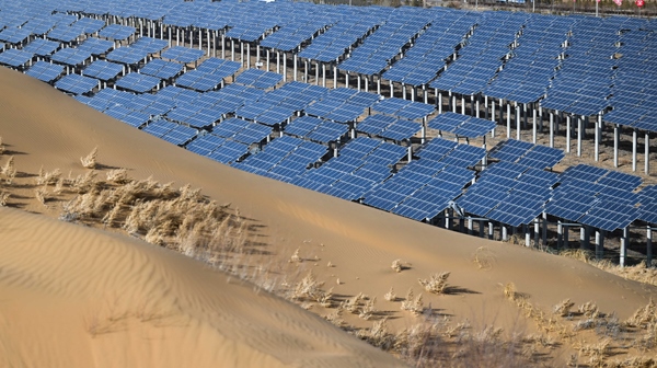 在鄂爾多斯市達拉特旗昭君鎮(zhèn)柴磴嘎查,346萬塊藍色光伏板隨著綿延的庫布其沙漠起伏,像陣陣波濤,在漫漫沙海中匯成3000萬平方米的光伏“海洋”。走在3米高的光伏架下,達拉特旗委書記張秀玲高興地介紹:“這里種的是1.2萬畝紅棗,那邊是5000畝黃芪和黃芩,更遠處是1.9萬畝的優(yōu)質(zhì)牧草。沙窩里種上作物,再從上面架起光伏板,相當于打了兩層‘保護傘’,黃沙休想亂跑?!?/p>