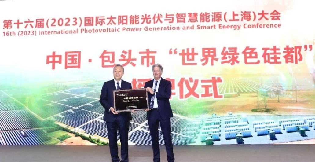 5月23日,第十六屆(2023)國(guó)際太陽(yáng)能光伏與智慧能源(上海)大會(huì)召開(kāi)。大會(huì)開(kāi)幕式上,全球綠色能源理事會(huì)授予包頭市“世界綠色硅都”稱(chēng)號(hào)。澳大利亞新南威爾士大學(xué)教授、超高效光電學(xué)研究中心兼任執(zhí)行研究主任、澳大利亞科學(xué)院院士馬丁·格林代表全球綠色能源理事會(huì)向包頭市授牌。自治區(qū)黨委常委、市委書(shū)記丁繡峰致辭并推介“世界綠色硅都”。市委副書(shū)記、市長(zhǎng)張銳代表包頭市接牌。