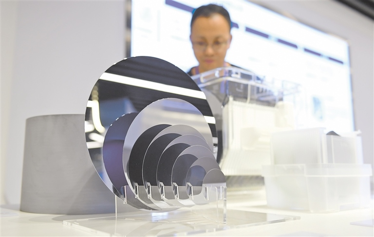 中環(huán)產業(yè)園展廳,工作人員介紹2-12英寸硅拋光片。