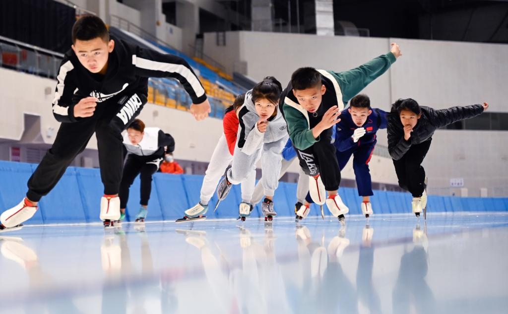 ??呼倫貝爾學(xué)院冰雪運(yùn)動(dòng)專(zhuān)業(yè)學(xué)生正在進(jìn)行滑冰訓(xùn)練。新華社記者 賀書(shū)琛 攝