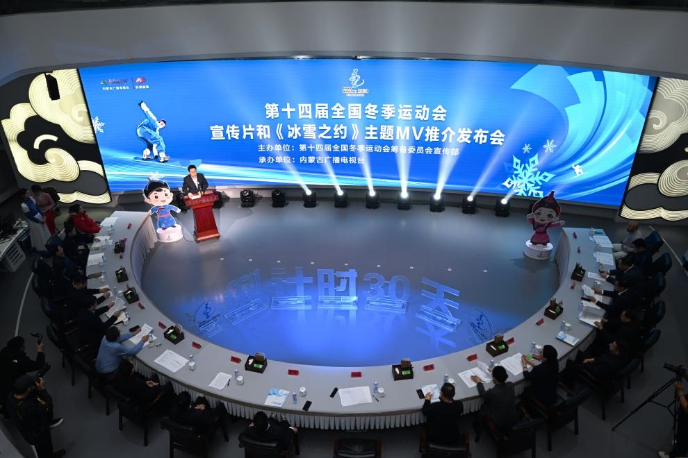 ??這是1月17日拍攝的第十四屆全國(guó)冬季運(yùn)動(dòng)會(huì)宣傳片和《冰雪之約》主題MV推介發(fā)布會(huì)現(xiàn)場(chǎng)。新華社記者 貝赫 攝